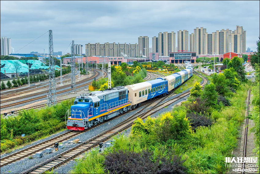 2025年8月。三棵树车辆段。DF7C将“悠享龙江号”旅游车体拽出三棵树车辆段。