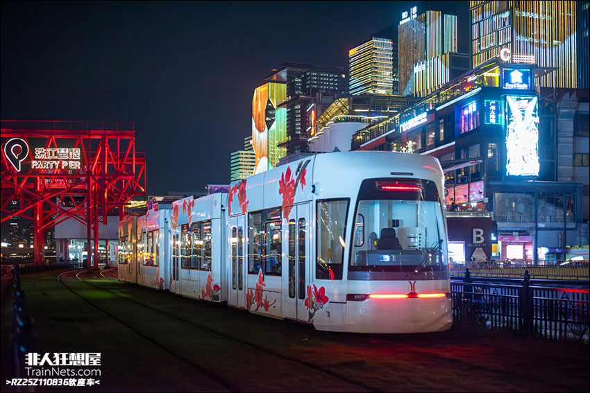 2025年8月25日,广州海珠有轨一号线,木棉花“标涂”有轨电车在夜间通过灯红酒绿的广州珠江·琶醍啤酒文化创意艺术区。