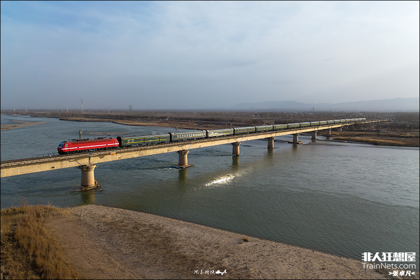 2025年1月10日,宝中线,SS7E牵引K360次(上海-银川)旅客列车行驶在宝中线黄河大桥上。