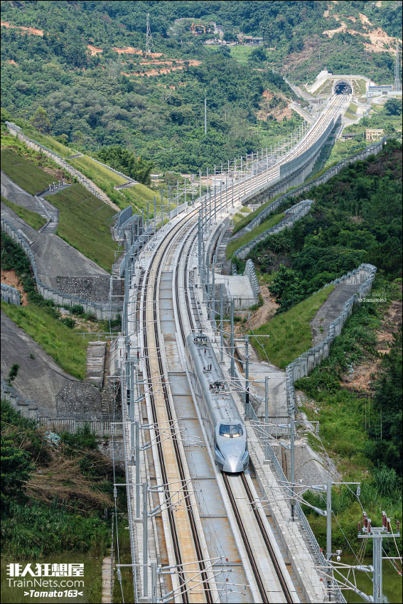 2025年9月4日,广湛高铁线西段,当日,由“青铜剑”担当的联调联试车正在反向运行打磨下行线,由于每次海南环岛高铁检测都是尖头端朝后运行,这也是作者第一次拍到“御剑”的视角。
