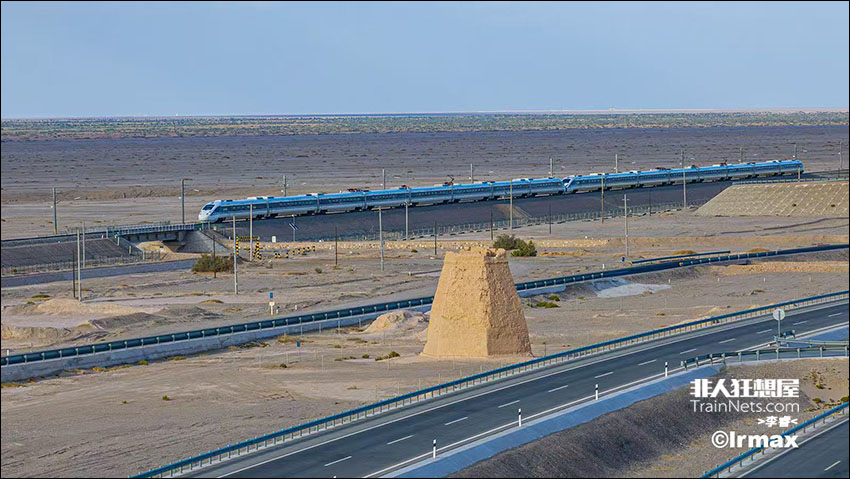 2024年7月。D4749次(兰州西-敦煌)沿敦煌铁路驶过汉长城空心墩。空心墩位于柳格高速、敦煌铁路和314省道路边,是汉长城在河西走廊和丝绸之路几百个烽燧中保存较完整的一个。