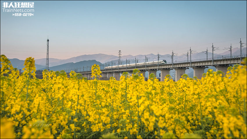 2025年3月,凉山彝族自治州越西县,成昆复线,动力集中动车组掠过早春时节的金色花海。