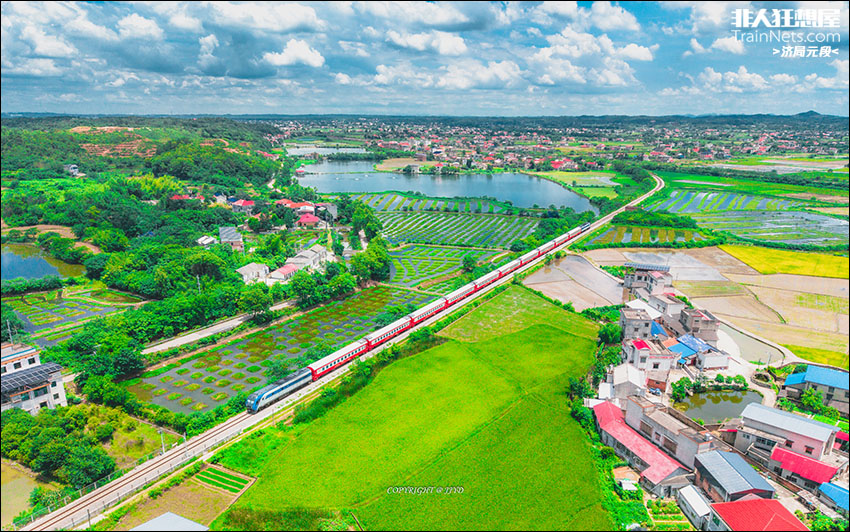 2025年6月,湖南湘潭。火红的列车在三湘大地上的蓝天绿水下恣意奔驰,Y714(韶山-永州)“我的韶山行”旅游列车行驶在韶山线上,接近向韶站。