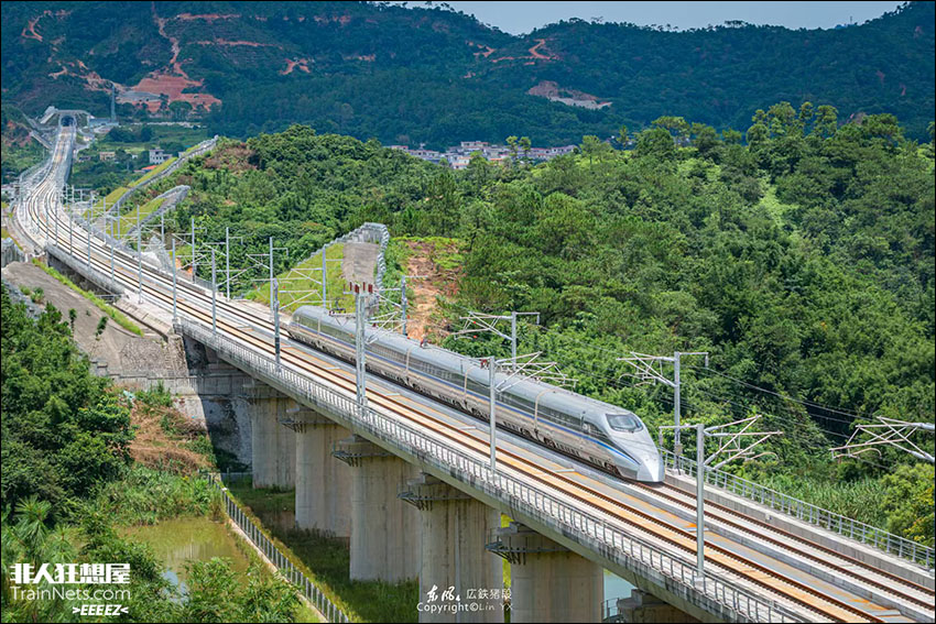 2025年9月4日,“青铜剑”CRH380AM-0204执行广湛高铁联调联试任务,行驶在粤西群山之中,为年底开通的目标做最后的冲刺。