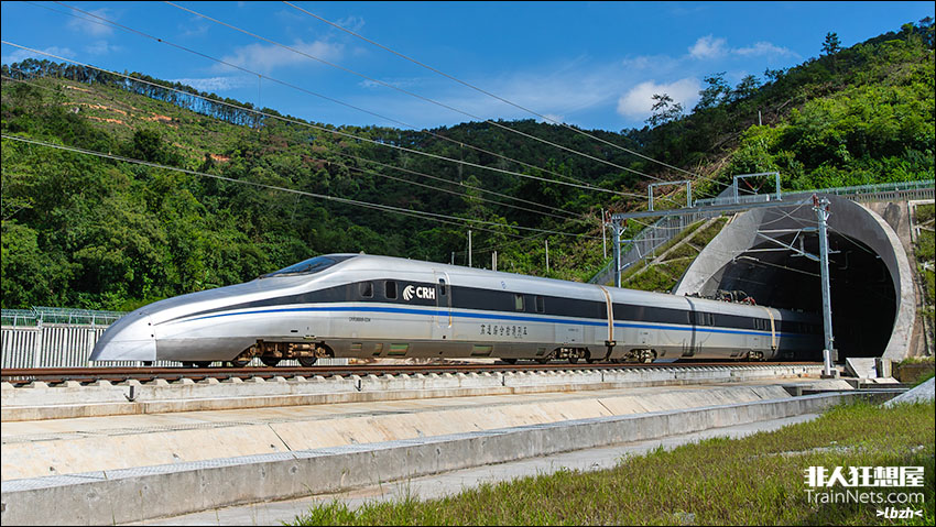 2025年9月14日,广东云浮,广湛高铁,CRH380AM-0204担当DJ55103次逐级提速试验列车冲出隧道。
