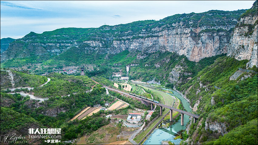 2025年6月18日,侯月线, 嘉峰-洛阳通勤57018次在太行山的峭壁下跨越沁河,接近磨滩站。