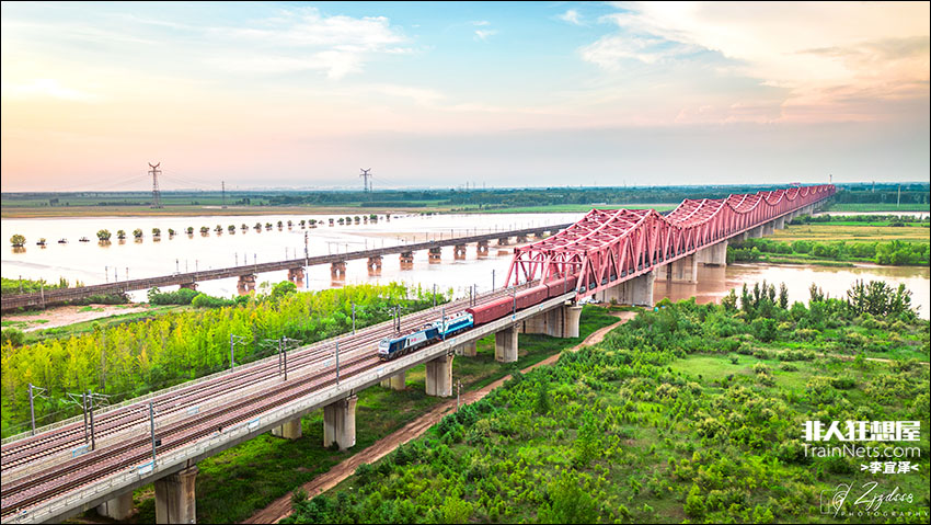 2025年7月24日,京广线,21507次回送太原厂轻大修郑局郑段SS8-0197跨越京广线黄河大桥,接近广武站。
