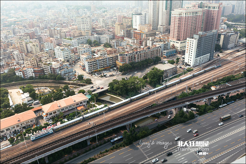 2019年7月。为方便大湾区人们的通勤需要,广铁集团采用广九直通车车底将机车编挂于两头的方式,开行了从广州-河源-深圳往返的列车,极大的满足了三地人们的出行。图为韶八“动集”通过深圳东站,即将抵达深圳站。