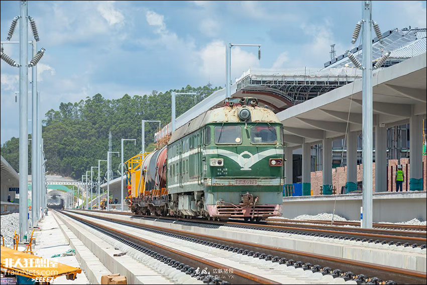 2025年7月9日,广湛高铁新兴南站施工现场,中铁十二局元老级瓜DF4B-0579牵引工程车辆在正线作业,打造新兴人民的第一条高铁。