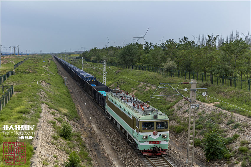 2025年8月,包兰线,兰局迎段SS3-4444牵引货列接近大坝车站。