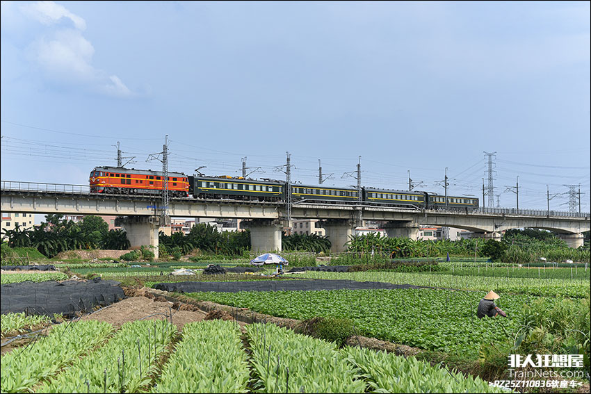 2025年9月30日,广石线,因台风等恶劣天气影响下推迟开行的广州枢纽综合检测列车57982次经过广州白云农业种植示范区前往广州北站。