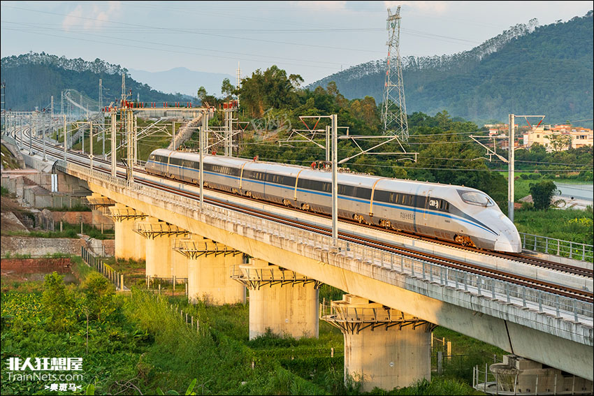 2025年9月14日,广东云浮。CRH380AM-0204担当逐级提速检测列车在夕阳下驶向检测终点新兴南站。