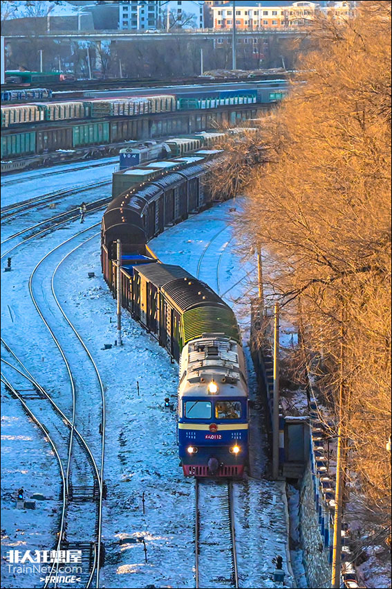 2024年2月初。中东铁路。夕阳西下时刻,国徽DF80112机车牵引混编货列驶出绥芬河南货场,准备出境。