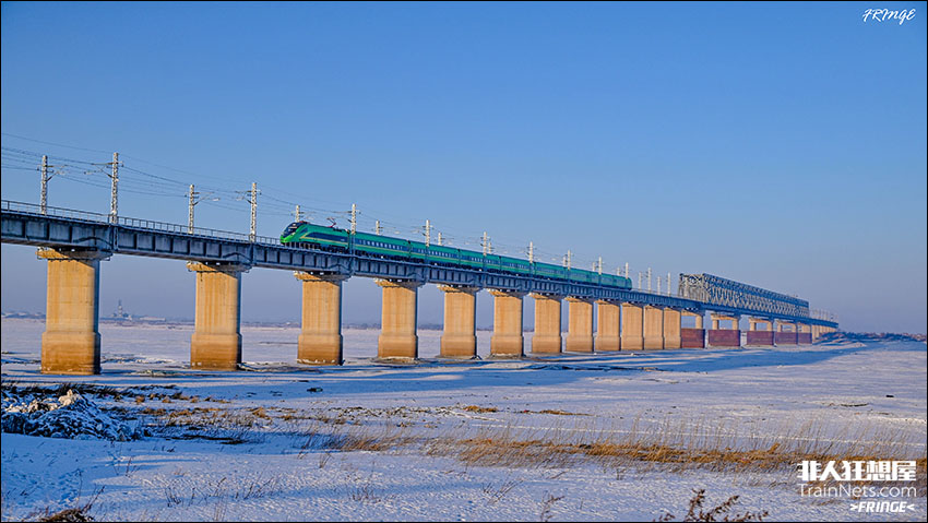 2024年2月初。佳鹤铁路,夕阳西下时刻,天空逐渐变成淡紫色,终到鹤岗的动集列车通过佳木斯松花江铁路大桥。