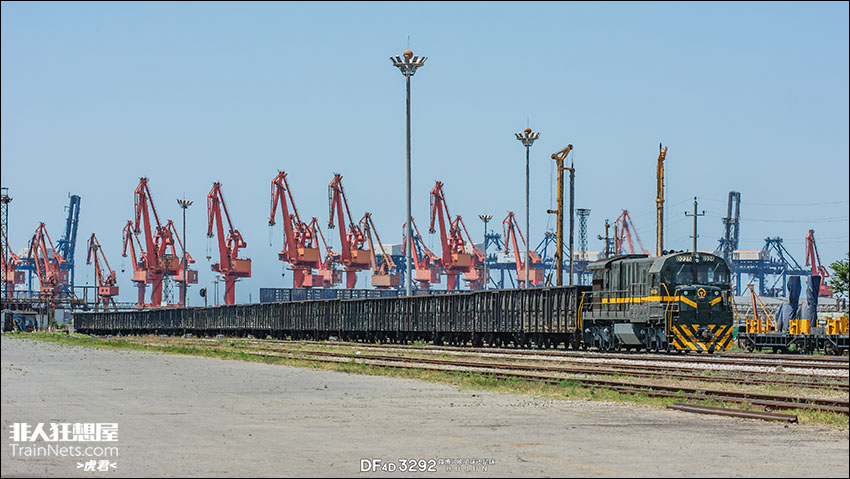2025年6月。辽宁营口。营口港。ND5-0225号内燃机车牵引货运列车通过营口港交接场。