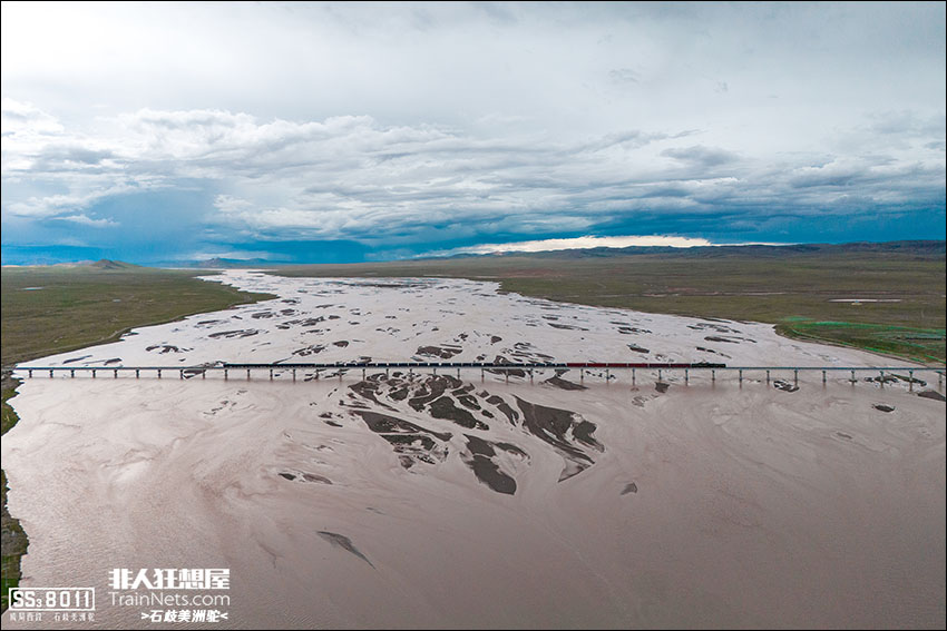 2025年7月30日,货列驶过沱沱河上的长江源大桥,夏季的沱沱河达到了河面最宽的时期。