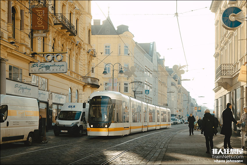 2025年1月30日,奥地利林茨。庞巴迪Cityrunner经过莫扎特十字(Mozartkreuzung)。尽管这里没有禁止汽车通行,但电车与商业一同,自然而然发展成了适合漫步的街道,这样的例子在欧洲似乎并不少见。