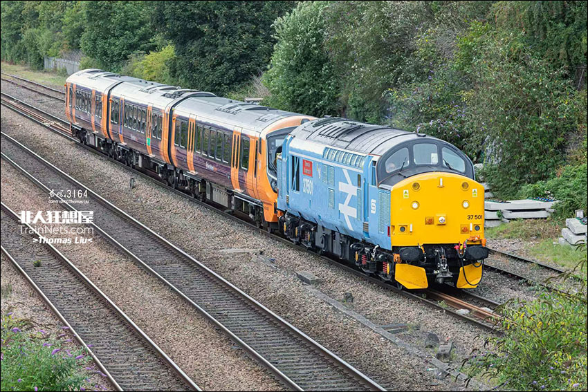 2025年8月7日,英国伯明翰。Class37 501号机车无火回送Class730 002号电力动车组,前往Tyseley维修车间。