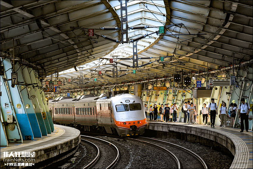 2025年10月14日,台铁纵贯线,推拉式自强号正在穿过早高峰的汐科站。由于原有的南非制E1000型电力机车日渐老化,现时正在被新购入的E500型电力机车逐步更替。