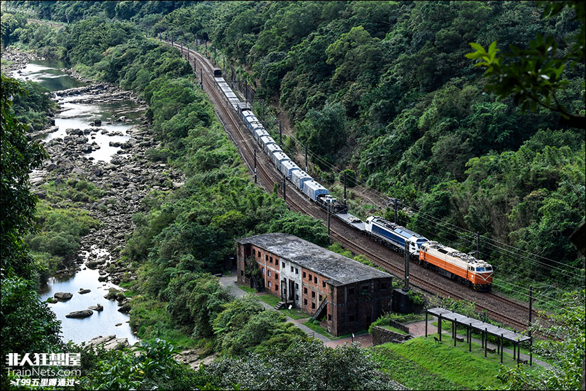 2025年10月14日,台铁纵贯线,R200型内燃机车与E400型电力机车重联牵引亚洲水泥自备货车,行驶在基隆河畔。北上货列为了翻越最大坡度达千分之16的牡丹坡,时常会加挂补机运行。
