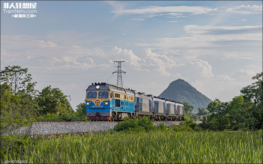 2023年7月。湘桂线横山-二塘。DF4D-4001牵引四台宁局邕段HXD3C接近二塘站,转配至南昌局。