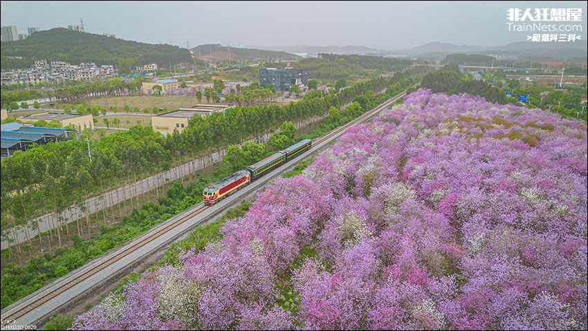 2025年4月,湘桂线,57872次接近雒容站,运行在洛埠-雒容区间,DF4D-3227牵引轨检车驶过紫荆花海。