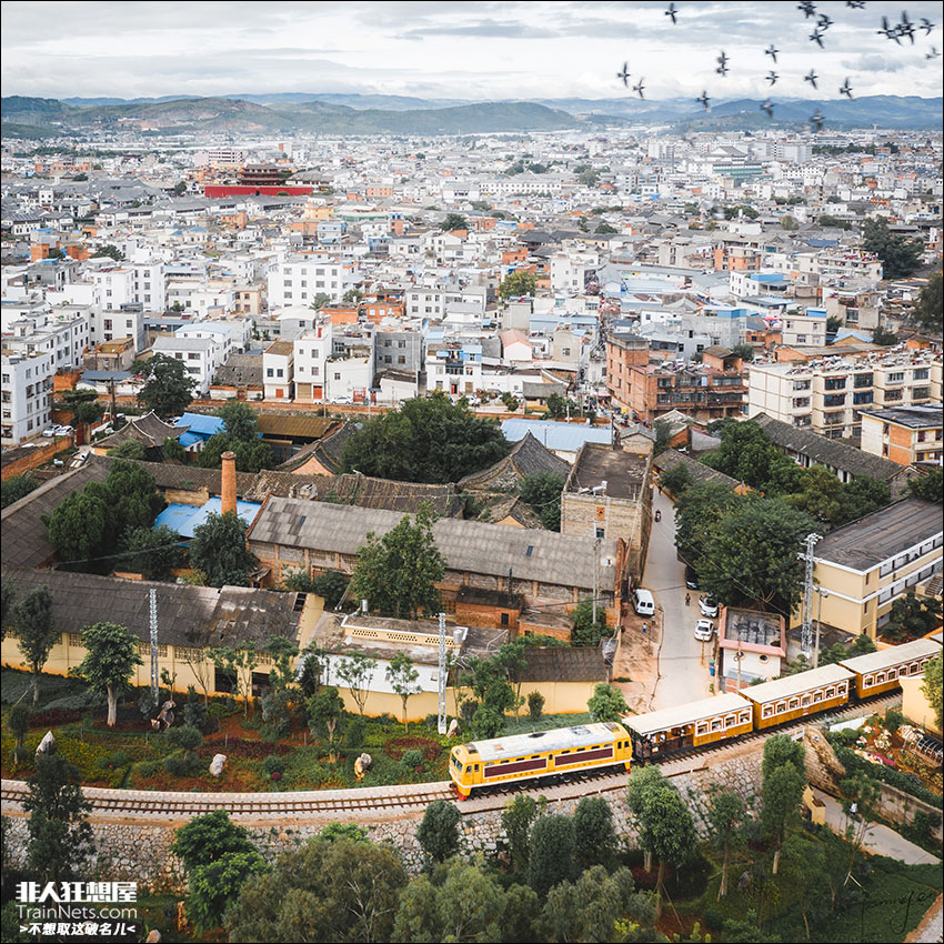 2021年8月,米轨观光车建水古城号正缓缓驶出建水临安站。远处,自由且繁荣的建水古城包围着中心地标朝阳楼。