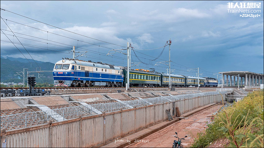 2025年6月12日,莞惠城际北延线。“狮子动集”试运行列车55005次对莞惠城际北延线进行联调联试,缓慢接近惠州北站。列车编组两台DF11型内燃机车夹着三节检测车厢,分别为接触网检测车、轨道检测车、隔离车。
