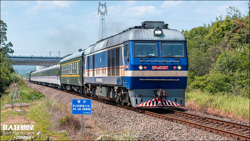 2025年4月30日,惠大铁路。中铁惠州公司的DF8B-0307牵引45419次列车,回送深圳地铁5号线增购车通过惠阳东站,前往大亚湾站转公路运输。