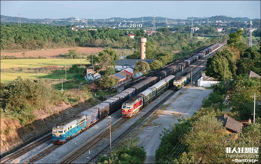 2025年10月10日,湘桂线,57877次列车通过井头圩站,在相距两个区间时,交汇的两趟列车便已经在站内停好,这张照片也有幸集齐了红绿蓝三色机车。