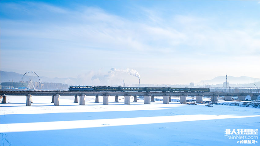 2022年2月22日,4318次列车(通化-丹东)行驶在跨越浑江的通灌线大桥上。