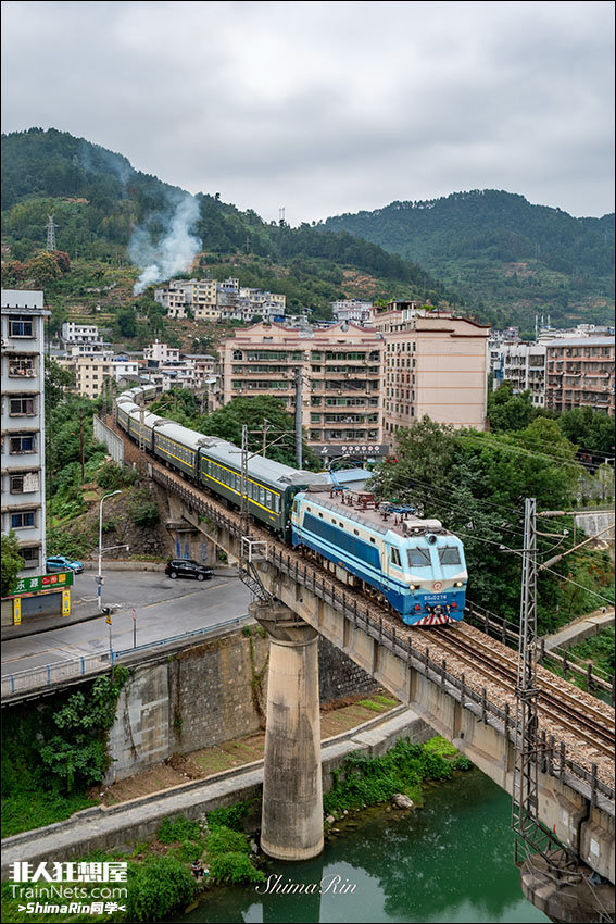 2025年10月,湖南省湘西地区,焦柳线。刚更换为SS8的“湘西慢车”7265次列车(张家界-怀化)缓缓出站通过城区。