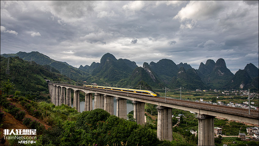 2025年7月21日,贵广高铁,DJ1004次高速通过阳朔幸福源水库上方,与后方的喀斯特地貌组成一幅和谐的画面。