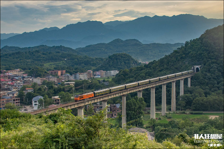 2025年6月24日,湖南永州,益湛线。娄邵橘子牵引宁局韶山行研学专列驶出下军山隧道,得益于研学专列编组较短,在这里可以排出全列效果。