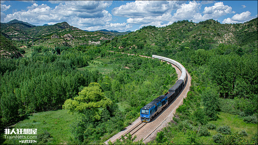 2025年7月29日,太焦铁路石会展线,FXN5C牵引货列离开石会站,通过展线下层。