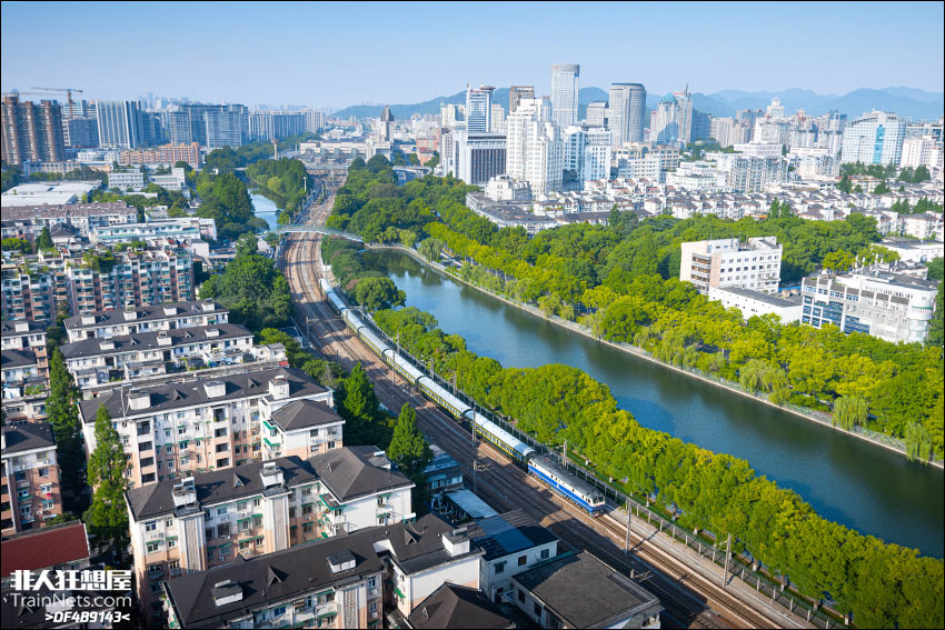 2025年7月4日,浙江杭州,沪昆绕行线,上局杭段DF11牵引8502次通勤列车接近艮山门站。