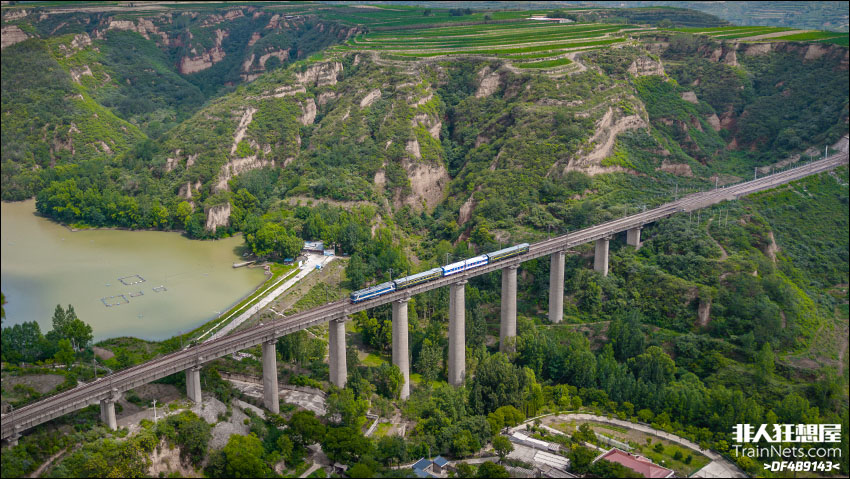 2025年7月10日,嘉峰至临汾开行57043/4次,经侯月线下行、高曲联络线、南同蒲上行线运行。图为检测列车穿行于在自然环境恶劣、线路条件复杂的侯月线上交站至桥上站区间。
