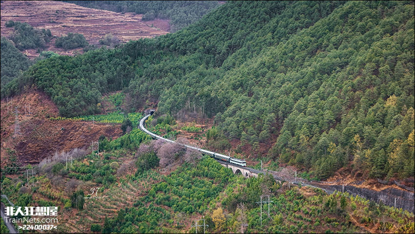 2025年4月5日,SS3-8057牵引5633次(普雄-攀枝花南)经过铁口二号桥,接近新凉站。