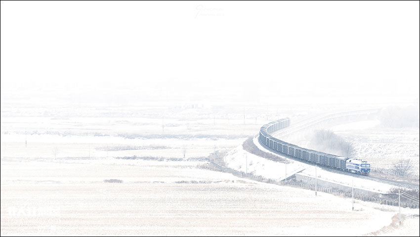 2025年11月30日,林东线鸡东-东海区间,东风8型机车牵引货列行走在小雪天气下的三江平原中。