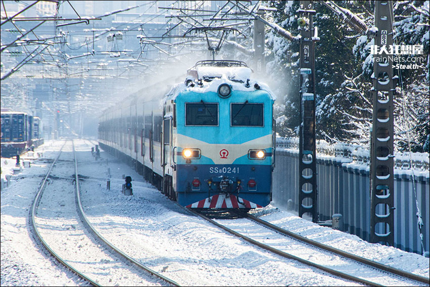 2024年1月,湖南长沙,京广线,停雪的第一天,K1347次列车(深圳-西安)上午到达长沙站并更换为SS8机车牵引,列车通过新开铺站时,车顶的大量积雪随风向外飞散,蓝色机车迎着阳光冲破弥漫的雪雾,成为湖南最独特的铁路风光。