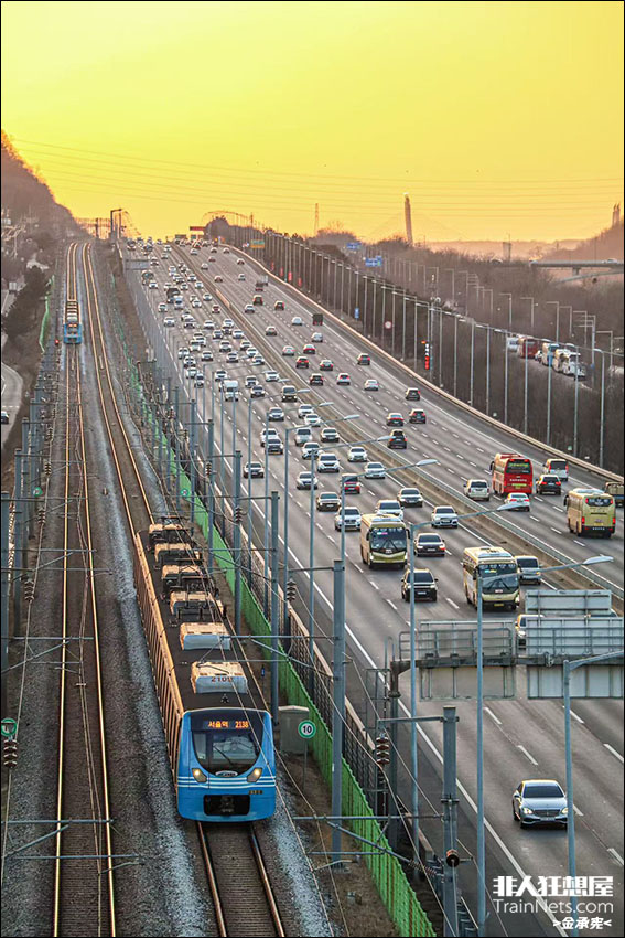 2025年2月1日。仁川国际机场线。夕阳西下的机场线列车追随金光,与机场高速公路的车海一起向西驶入东北亚第一国际机场-仁川国际机场。