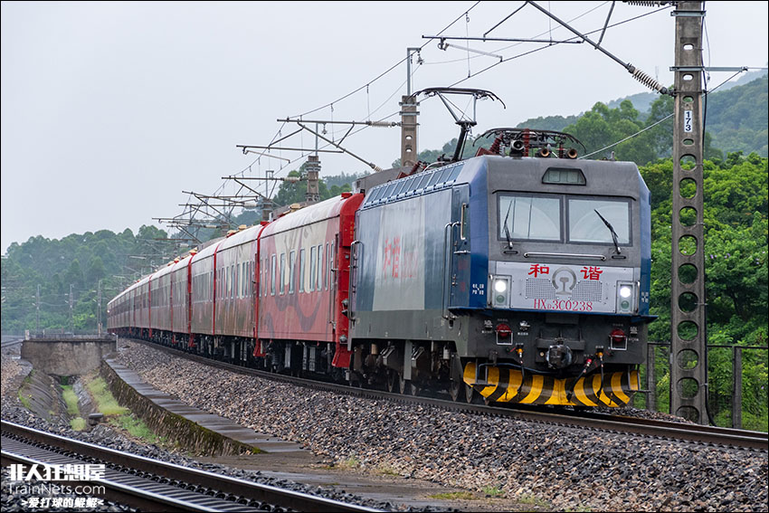 2025年7月11日,广东清远,广铁长段HXD3C-0238牵引“潇湘号”旅游列车行驶在京广铁路上。