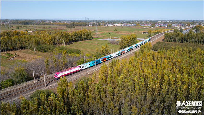 2025年11月9日,SS9-0141牵引Y955次“星光燕赵号”旅游列车,行驶在金秋时节的华北平原,接近定州站。