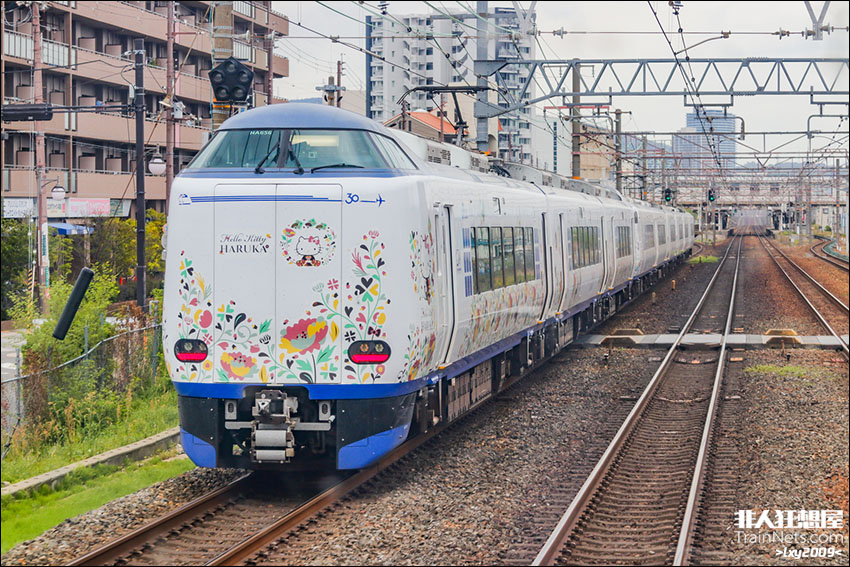 2025年4月,JR东海道线(西日本此处爱称为京都线),行驶在四线区间的关西空港特急Haruka同向超过内侧线路的普通列车。