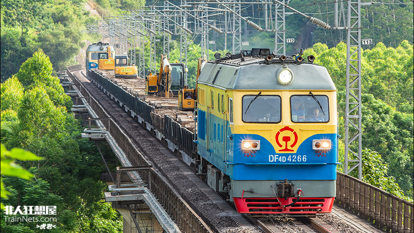 2025年7月。广西南宁。南防线。南防铁路线路大修施工列车通过大桥。