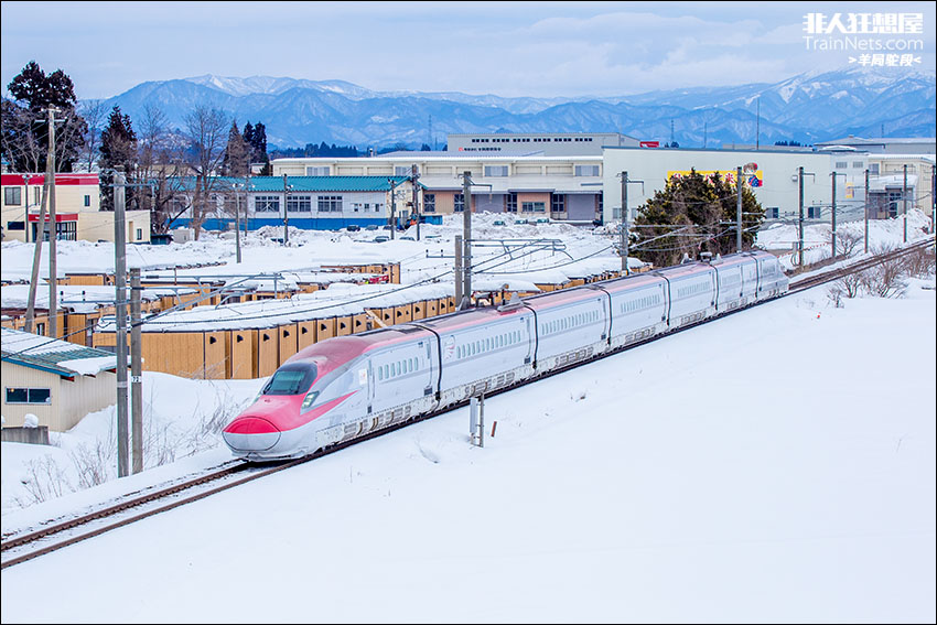 2025年2月,こまち号行驶在由田沢湖线升级改造的秋田新干线大曲站附近,E6系红色的涂装在白雪皑皑的雪地中颇为亮眼。