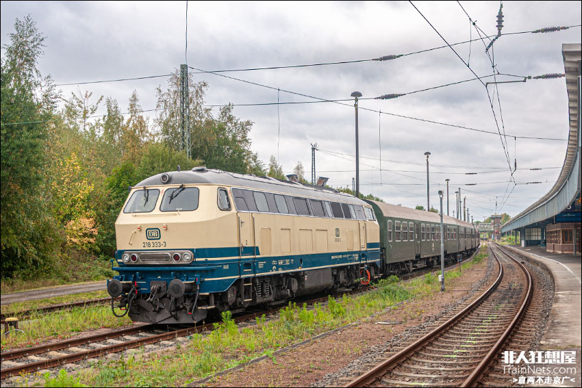 2025年9月20日,茨维考,BR 218牵引的非空调旅游列车停放在Zwickau Hbf侧线,BR 218是德铁经典内燃机车,在上世纪60、70年代开始生产。
