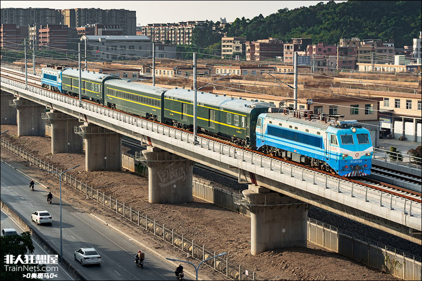 2025年12月1日。广东佛山。由SS8-0150&0138组成的“八集”检测列车在完成湛江北动车所动走线检测任务后,开行55214次在回送广州途中驶下高中立交特大桥。