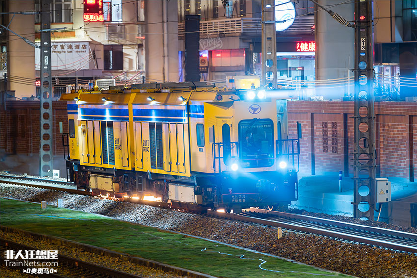 2025年10月27日。广东广州。CMC-20型道岔打磨车在原射击场道口路段进行线路打磨作业。