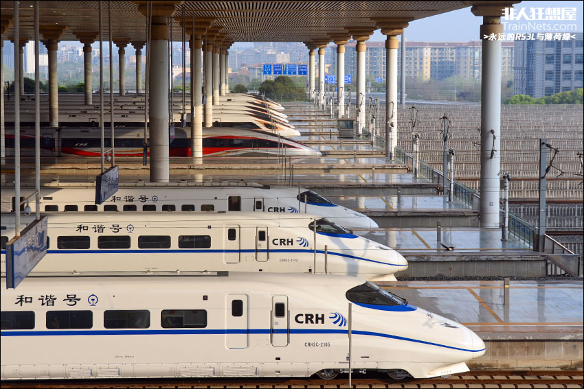 2025年4月5日,清晨,南京南站蓄势待发动车组。